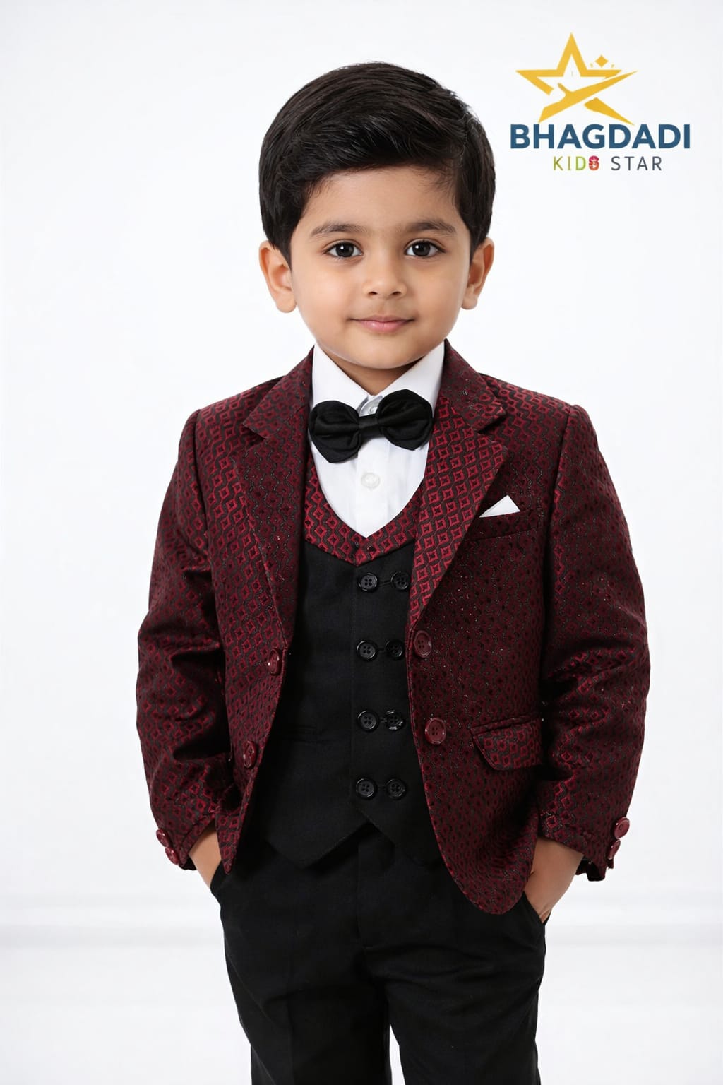 Make your little one stand out in style with this elegant Bhagdadi Kids Star 4-Piece Formal Suit. Designed for special occasions, this premium outfit features a beautifully textured green coat paired with a classic black waistcoat, crisp white shirt, smart bow tie, and matching black pants.